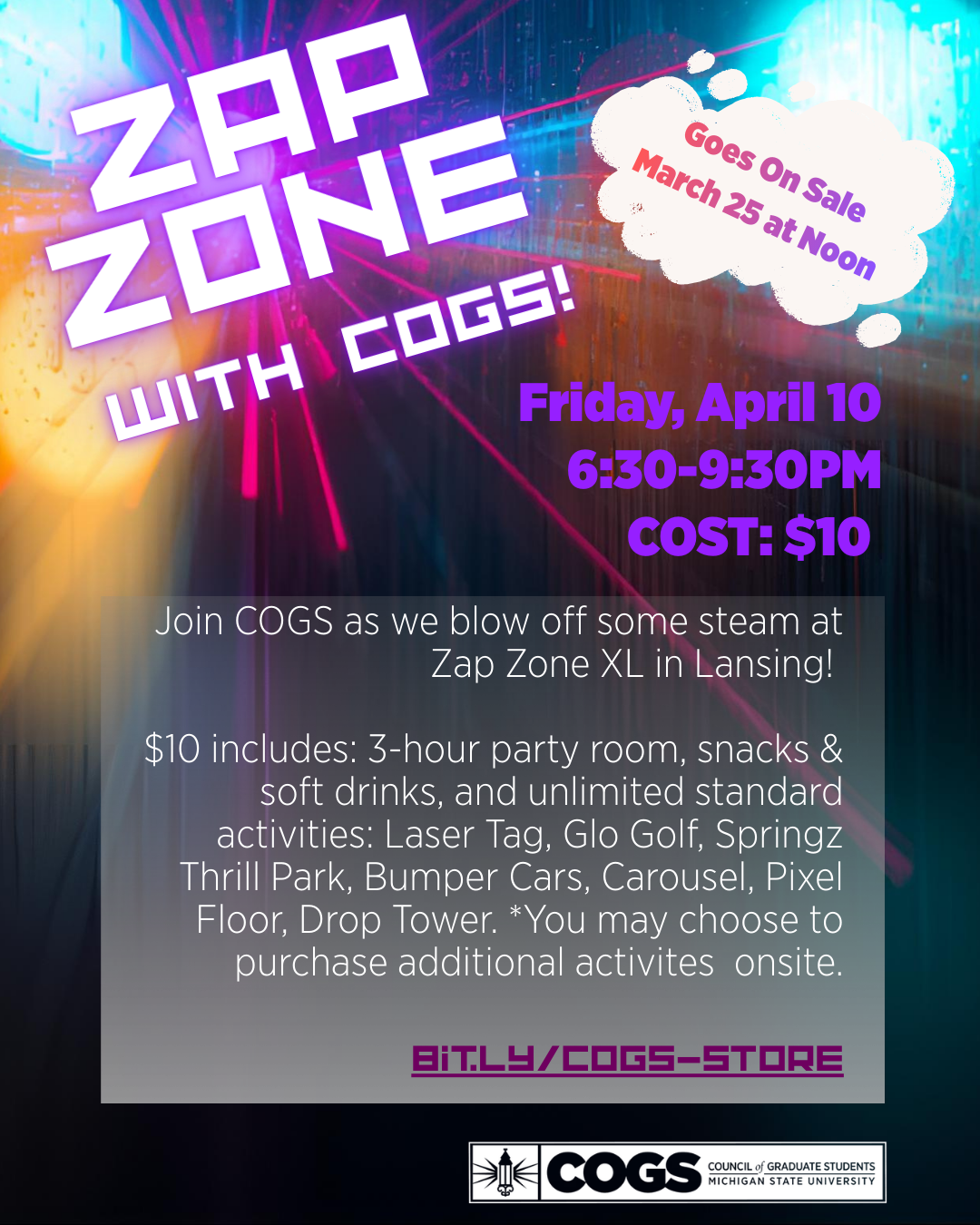 Join COGS As we blow off some steam at Zap Zone XL in Lansing! Limited tickets available, first-come, first served.