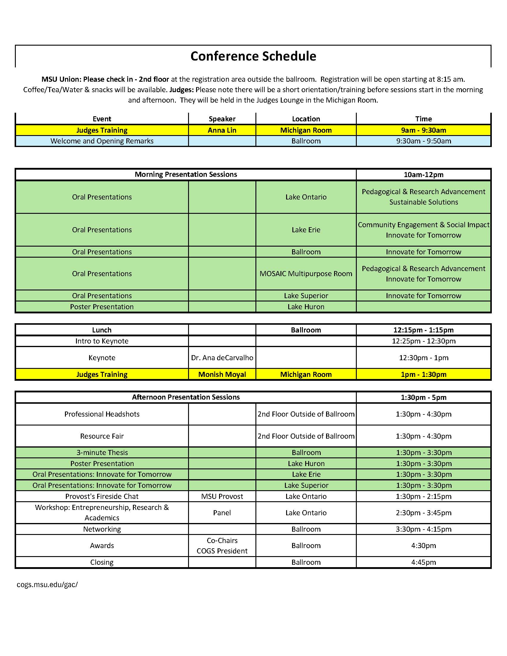 Click on the link above if you need a quick glance at presentation times or location. Or come to the Registration Area (2nd floor outside of ballroom) if you need assistance!